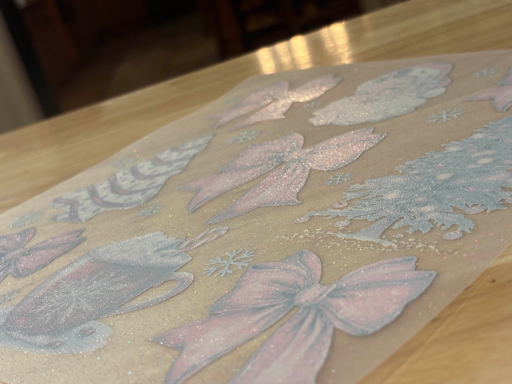 Merry design sparkling with glitter! Temp is 335* for 35 seconds. No washing or drying 24-48 hours after pressing. Wash inside out no dry cleaning! This transfer is warm peel with a 1-4 hour TAT for local pick up.